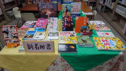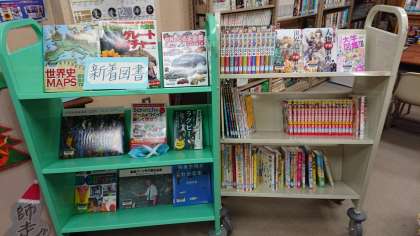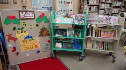 図書館を入ったらすぐに、クリスマス飾りとともに、「新着図書」が並んでいます。