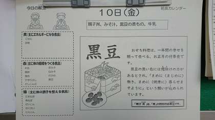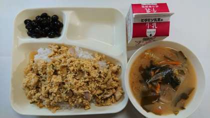 本日の献立は、親子丼、黒豆の煮物、味噌汁、牛乳です。