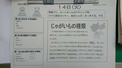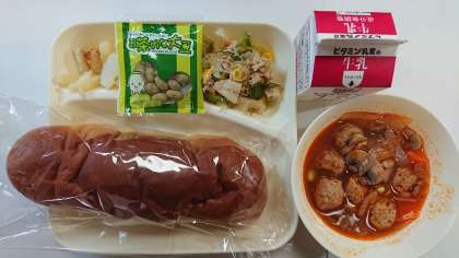 本日の献立は、ツナと野菜のソテー、焼きじゃが、ミートボールのケチャップ煮、黒糖パン、牛乳、抹茶大豆です。
