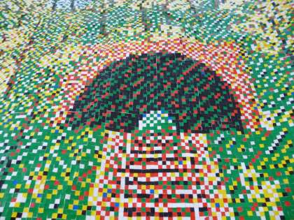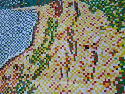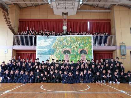 先日の文化発表会で制作した「トンネルのある風景」のモザイク画の前で記念撮影をしました。