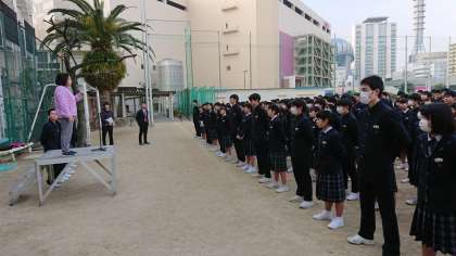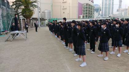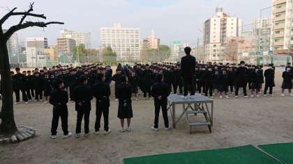 続いて、2学期終業式にお話をした、「大阪市いじめを考える中学生フォーラム」に参加した生徒会役員から、いじめ撲滅に向けた取り組みについて、皆さんに提案があります。