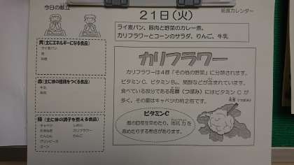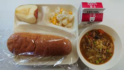 本日の献立は、鶏肉と野菜のカレー煮、カリフラワーとコーンのサラダ、ライ麦パン、りんご、牛乳です。