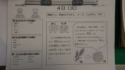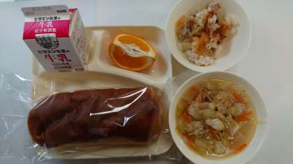 本日の献立は、押し麦のグラタン、スープ、黒糖パン、いよかん、牛乳です。