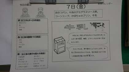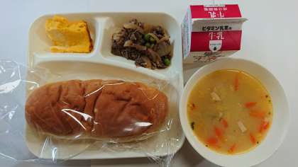 本日の献立は、牛肉のデミグラスソース煮、コーンスープ、おさつパン、かぼちゃのプリン、牛乳です。