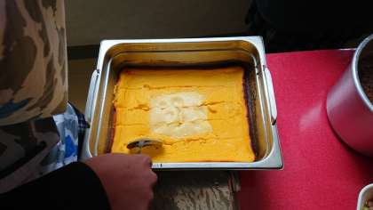 手作りかぼちゃのプリンを、給食当番が上手に均等に分けています。