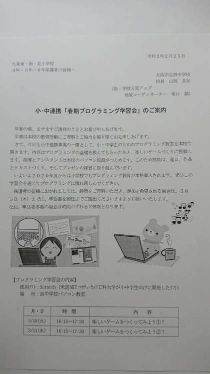 本日付で、小中連携「春期プログラミング学習会」のご案内を配付させていただきます。