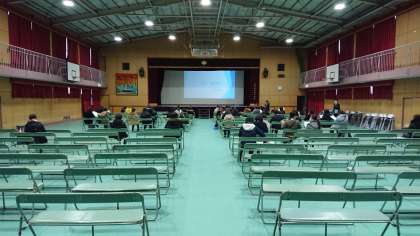 午後4時より、場所を多目的室から体育館にかえて、「修学旅行保護者説明会」を実施しました。