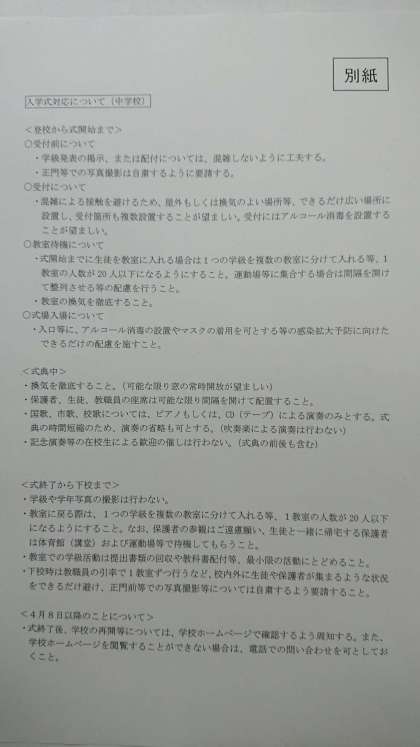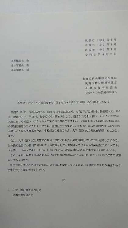 本日の入学式について、昨日夕方に教育委員会より次のような通知がありました。