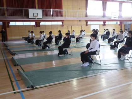 ソーシャルディスタンスを保って、座席が用意され、1クラス全員が着席しました。