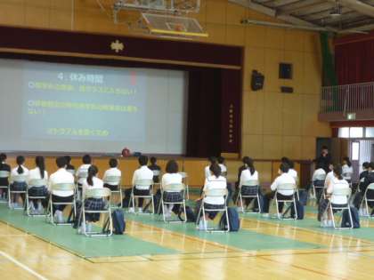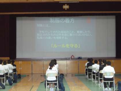 舞台のスライドを見ながら、学校でのルールや学校生活の説明を聞きました。