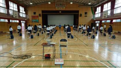 本日は体育館での発育測定です。十分にソーシャルディスタンスをとって、測定しています。