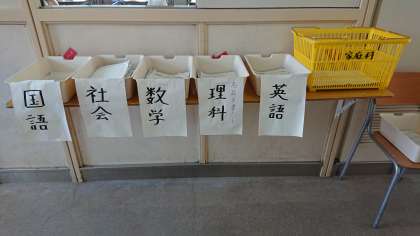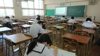 3教室に別れて入室し、課題を提出した後、課題確認テスト(英語・理科・社会)に取り組みました。