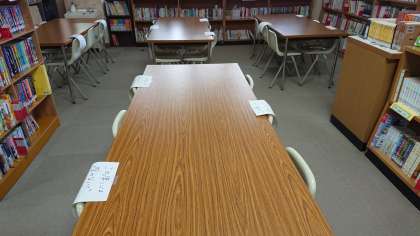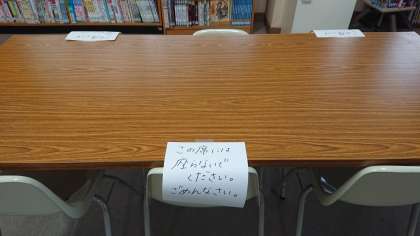 今後、図書館内で本を読むときには、間隔をあけるため、向かい合わせになる椅子は使用を控えるように張り紙をしていますのでご協力ください。