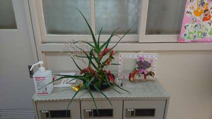 昨日の部活動紹介の時に使ったアレンジフラワーを、華道部の皆さんが校長室前と保健室前に飾ってくださいました。