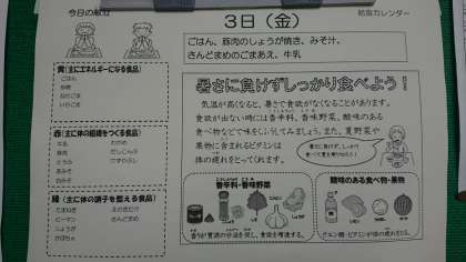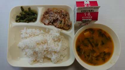 本日の献立は、豚肉の生姜焼き、三度豆の胡麻和え、味噌汁、ごはん、牛乳です。