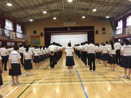 体育館で、全校集会が行われました。間隔を保って、きちんと整列。朝の挨拶です。