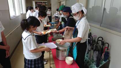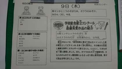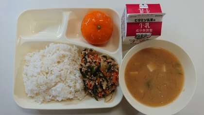 本日の献立は、豚ミンチとニラのそぼろ丼、オクラの味噌汁、牛乳、みかん(冷)、牛乳です。