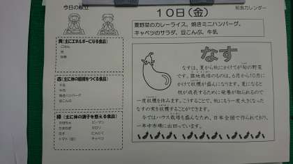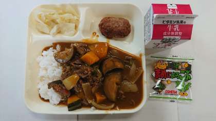 本日の献立は、夏野菜のカレーライス、焼きミニハンバーグ、キャベツのサラダ、豆昆布、牛乳です。