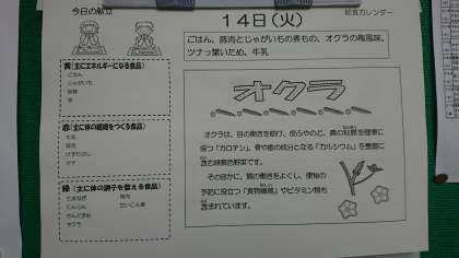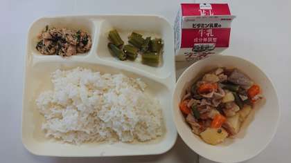 本日の献立は、豚肉とじゃがいもの煮物、オクラの梅風味、ツナッ葉炒め、ごはん、牛乳です。