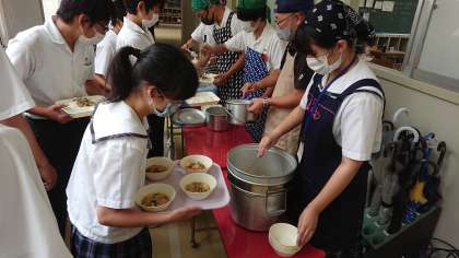 給食当番が、とても献身的にテキパキと配膳してくれています。