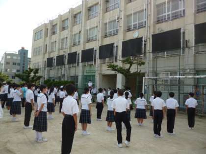 8時25分、生徒会の進行で、運動場に整列し、全校集会が始まります。
