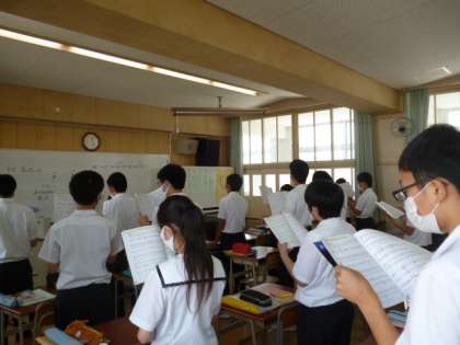 2年2組は、音楽の授業です。全員が起立して、ピンと背筋を伸ばした姿勢で、歌っています。ピアノの伴奏に、さわやかな歌声が聞こえてきました。