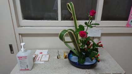 花材は、ニューサイラン、バラ、ヒペリカムです。