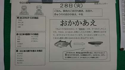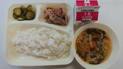 本日の献立は、豚肉のごまだれ焼き、きゅうりのおかか和え、五目汁、ごはん、牛乳です。