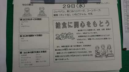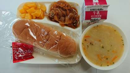 本日の献立は、煮込みハンバーグ、コーンスープ、コッペパン、いちごジャム、牛乳、黄桃(カット缶)です。
