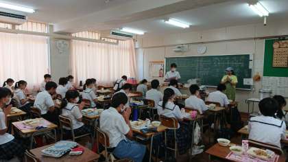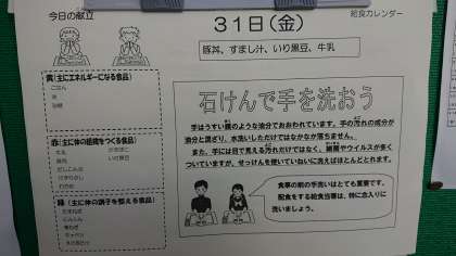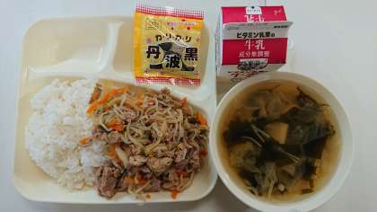本日の献立は、豚丼、すまし汁、煎り黒豆、牛乳です。