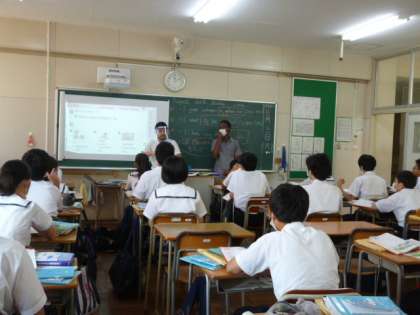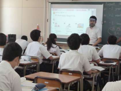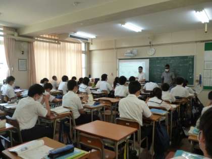 4時限目、2年2組は、英語の授業で、C-netのモリス先生も加わっています。英語科の山本先生が、手振りなども使ってわかりやすく説明していました。
