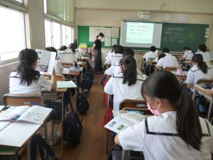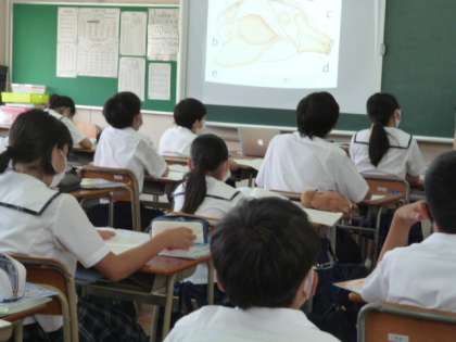 1年1組は、理科の授業です。教科書やスクリーンの図を見ながら、無脊椎動物の体の仕組みを勉強しました。