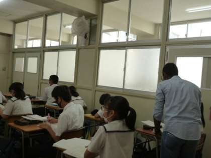 2時限目、3年3組は、英語の授業です。英語の問いに答えながら、ノートに書いています。C-netのモリス先生が、一人ずつ、教えてくれています。
