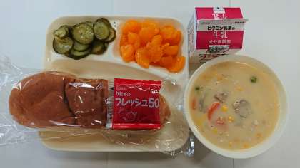 本日の献立は、コーンクリームシチュー、きゅうりのバジル風味サラダ、コッペパン、いちごジャム、みかん(缶)、牛乳です。