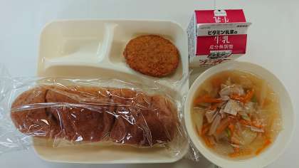 本日の献立は、チキンレバーカツ、スープ、ライ麦パン、牛乳です。