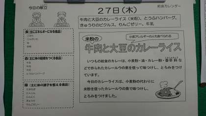本日の献立は、牛肉と大豆のカレーライス(米粉)、豆腐ハンバーグ、きゅうりのピクルス、りんごゼリー、牛乳です。
