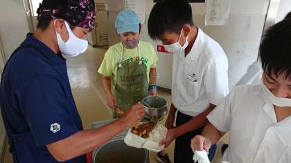 今日は子どもたちお待ちかねのカレーライスの日です。豆腐ハンバーグ付きです。