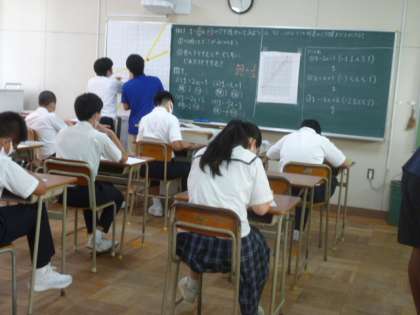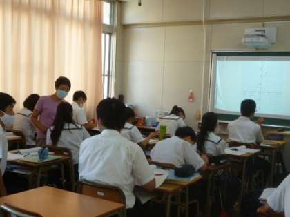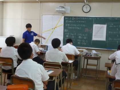 1次関数で、傾き、切片などを考え、グラフに表すところです。前に出て、切片に位置を示しました。