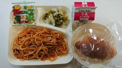 本日の献立は、イタリアンスパゲッティ、グリーンアスパラガスとキャベツのサラダ、黒糖ロールパン、豆昆布、牛乳です。