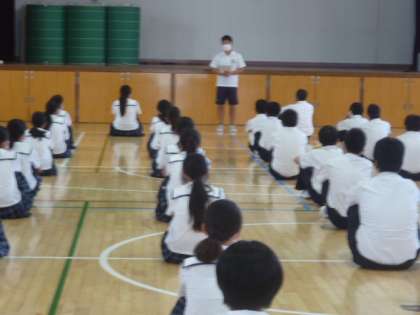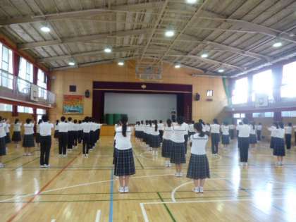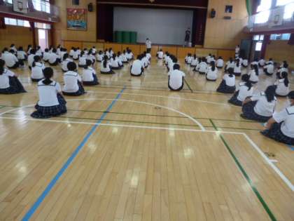 週のはじまり、月曜日の朝です。今日は、全校集会が中止ですが、1年の学年集会が行われました。学年代表が先頭で整列し、人員点呼、朝の挨拶、そして、大森先生のお話を聞きました。