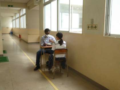 英語の授業では、生徒が順番に、モリス先生と1対1の英会話を行っています。