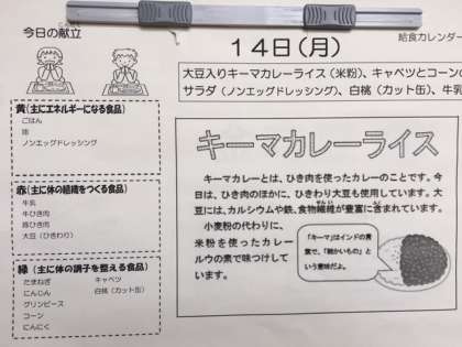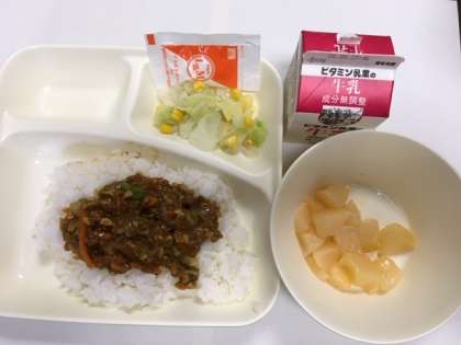 本日の献立は、大豆入りキーマカレーラオス(米粉)、キャベツとコーンのサラダ(ノンエッグドレッシング)、白桃(カット缶)、牛乳です。
