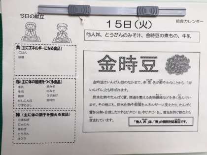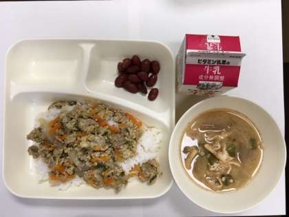 本日の献立は、他人丼、とうがんのみそ汁、金時豆の煮もの、牛乳です。