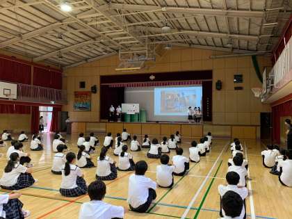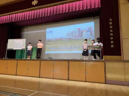 実は先日クラスだけでの発表会も行っています。そして、各クラス6班の中から選ばれた2班ずつが学年発表をしました。初めて体育館という大きな場所で、学年全員の前で発表するということだったので、舞台袖ではみんな緊張の色が隠せませんでした。しかし、舞台に出てしまえばみんな練習の成果を発揮し、とても素晴らしい発表ができていました。本当に限られた時間の中でよく頑張りました。
