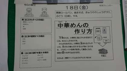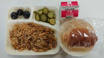 本日の献立は、焼きそば、きゅうりの生姜漬け、黒糖ロールパン、ぶどう(巨峰)、牛乳です。