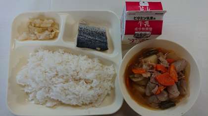 本日の献立は、さごしの塩焼き、豚肉とじゃがいもの煮物、キャベツの梅風味、ごはん、牛乳です。