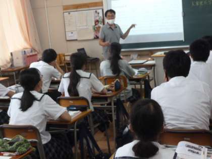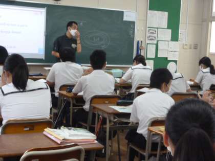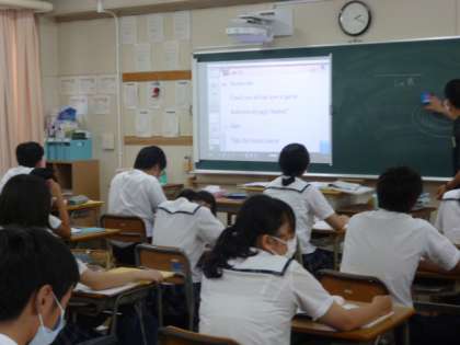 社会では、スクリーンに映した教材を使って、第2次世界大戦時代の様子を学んでいます。