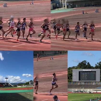 続いて1500mの久世。慢性的な故障もあり、直前まで棄権することも考えていましたが、ウォーミングアップを見ると、痛みはあると言うものの軽い動きができていました。レースは全員が4分10秒台、20秒台のベストタイムを持つ、力の拮抗したメンバーで行われました。1周400mを67〜68秒で走るという非常にいいペースでレースが進み、自己ベスト更新、8位入賞を果たすことができました。