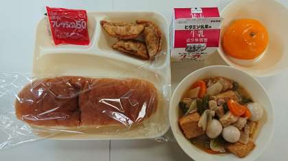 本日の献立は、揚げ餃子、中華煮、コッペパン、いちごジャム、みかん(冷)、牛乳です。