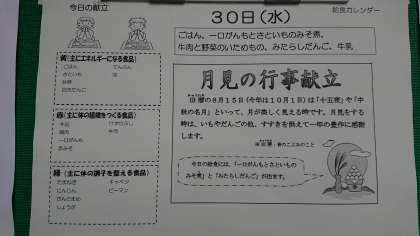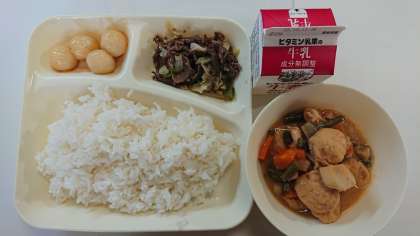 本日の献立は、一口がんもと里芋の味噌煮、牛肉と野菜の炒め物、ごはん、牛乳、みたらし団子です。